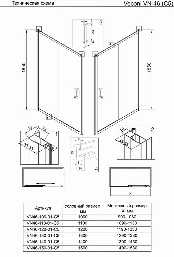 Душевая дверь Veconi 130 VN-46 (VN46-130-01-C5) 6мм