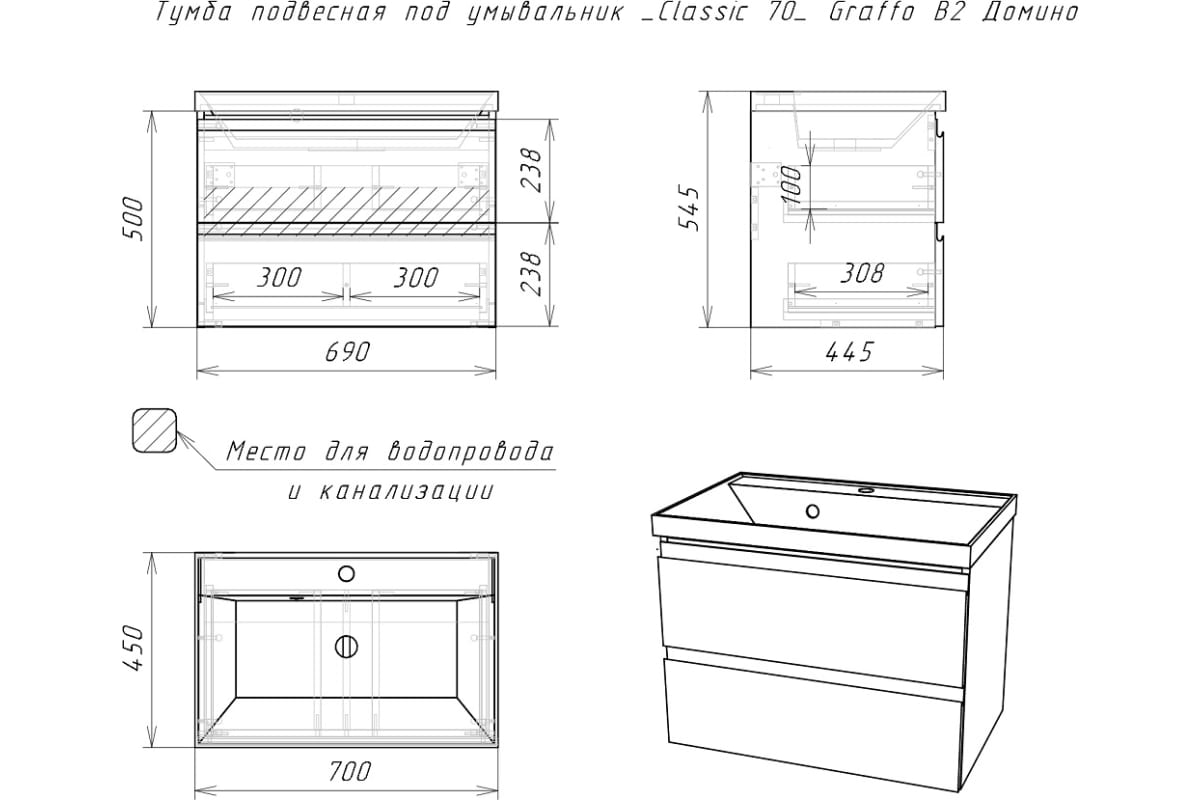 Тумба Graffo 70 подв.2ящ.графит мат.