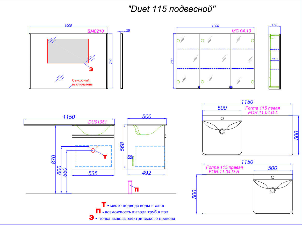 Умывальник литьевой мрамор Forma 115х50 см (чаша слева) – арт. FOR.11.04.D-L или (чаша справа) – арт. FOR.11.04.D-R