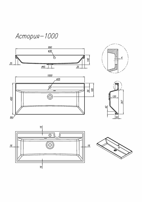 Ширина раковины: 1000 мм
