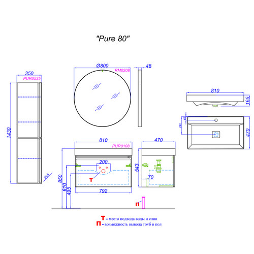 Тумба Pure 80 T8/KS подв.капучино светлый (рак.Вилис 810)